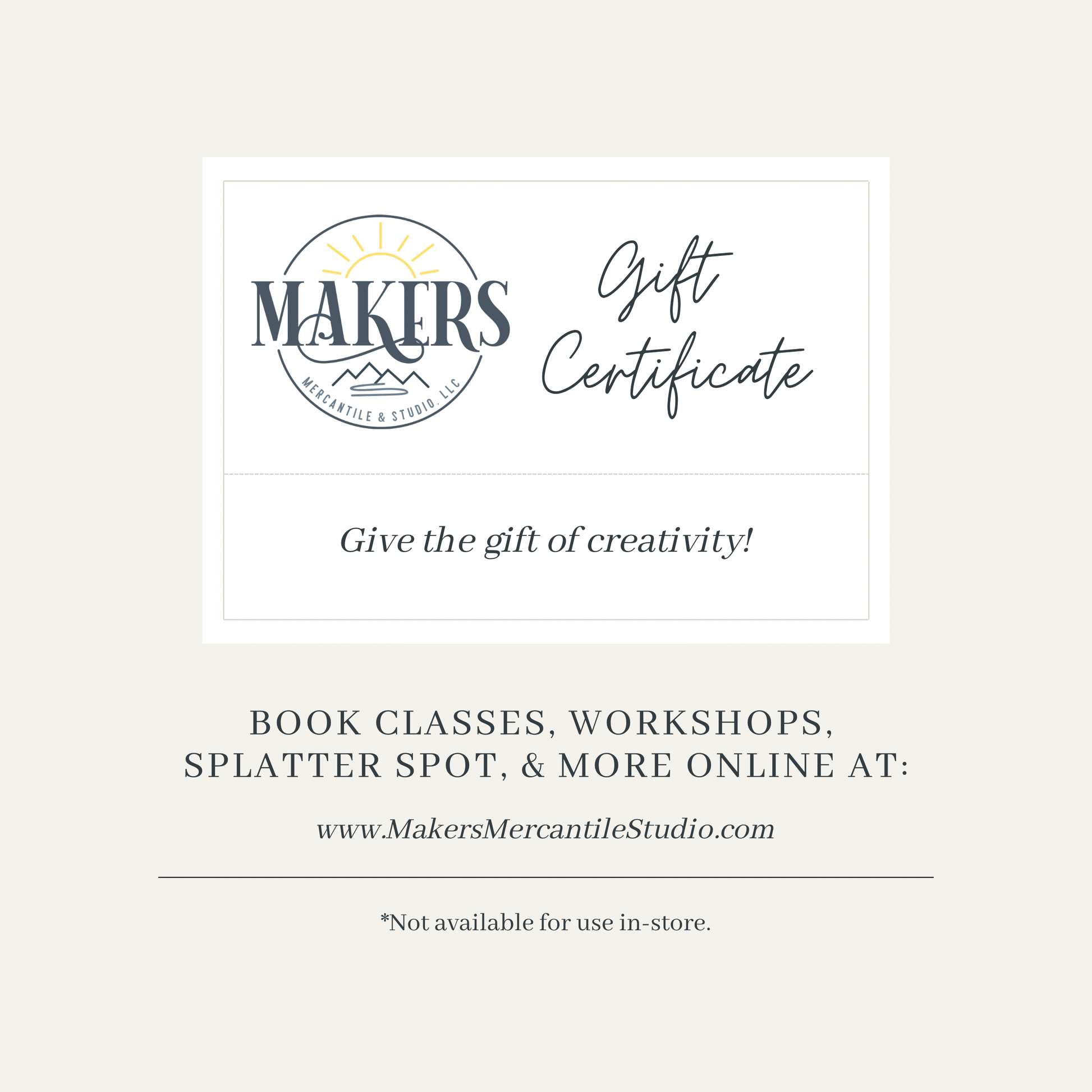 Treat someone to a fun studio or Splatter Spot session! These Studio gift cards are good for classes, workshops, and Splatter Spot reservations only. Please visit our store in person for Mercantile gift cards.